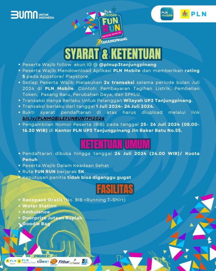vokalriau.com-Tanjungpinang – PT PLN (Persero) mengajak para runners ambil bagian dalam kegiatan 5K PLN Mobile Fun Run 2024 yang akan diselenggarakan pada 28 Juli 2024, PLN Mobile Fun Run yang mengambil titik start pada lokasi Tugu Sirih tepi laut kota Tanjungpinang selanjutnya akan Finish tepat didepan Gedung Daerah Tanjungpinang Kepulauan Riau pada 28 Juli 2024. Kegiatan fun run sejauh 5 kilometer ini bertujuan mengajak peserta agar menerapkan pola hidup sehat dengan berolahraga, bersosialisasi serta bergembira melalui berbagai aktifitas menarik.